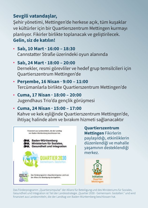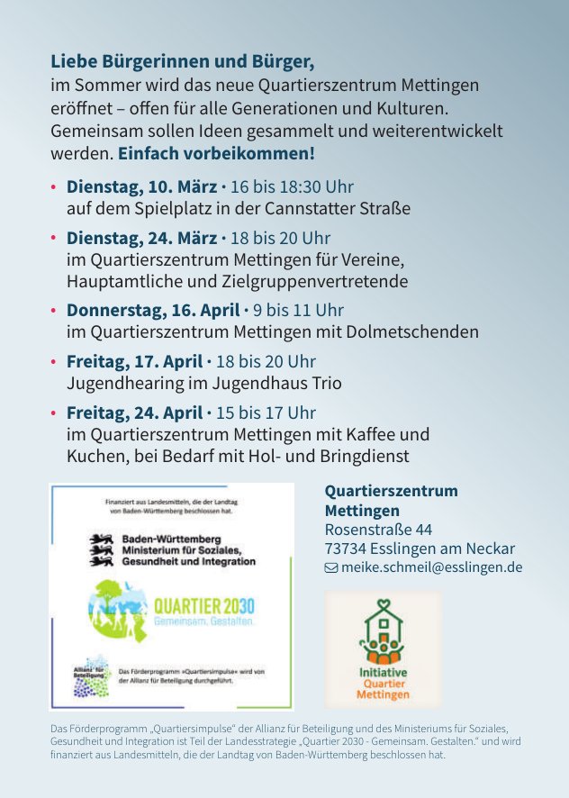 Damit Menschen im Stadtteil sich begegnen, austauschen und gemeinsam aktiv werden können, bauen wir das Quartierszentrum Mettingen auf und entwickeln gemeinsam mit den Bewohnerinnen und Bewohnern Ideen dafür, was dort alles möglich sein könnte – offen für alle Generationen und Kulturen. Auf dieser Seite finden Sie alle Neuigkeiten zum Projekt und zur Beteiligung.