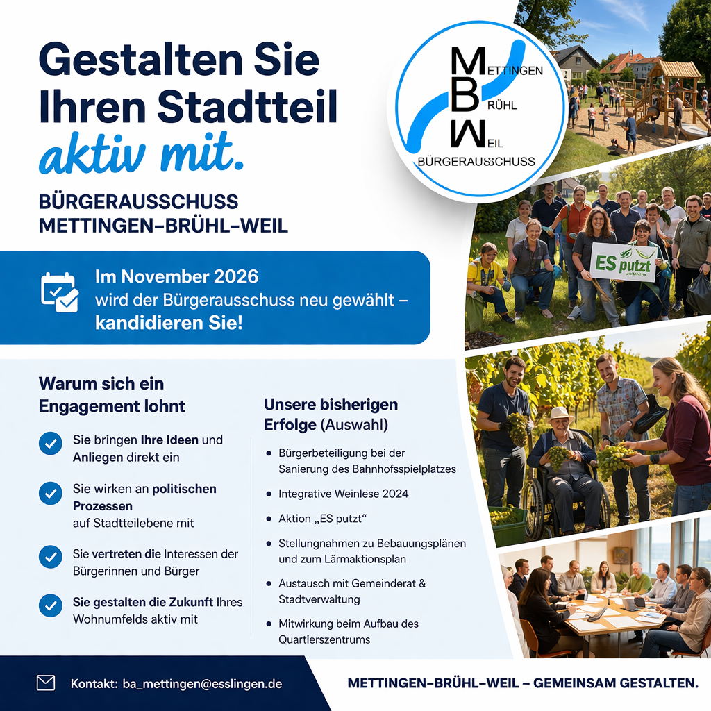 Bereits zum zweiten Mal lud der Bürgerausschuss Mettingen-Brühl-Weil zum Bürgerdialog unter dem Motto „Wo drückt der Schuh?“ auf den Hermann-Sohn-Platz ein – und erneut wurde das Format sehr gut angenommen. Mehr als 20 engagierte Bürgerinnen und Bürger kamen am Samstag zusammen, um über die Herausforderungen und Wünsche für ihren Stadtteil zu sprechen.