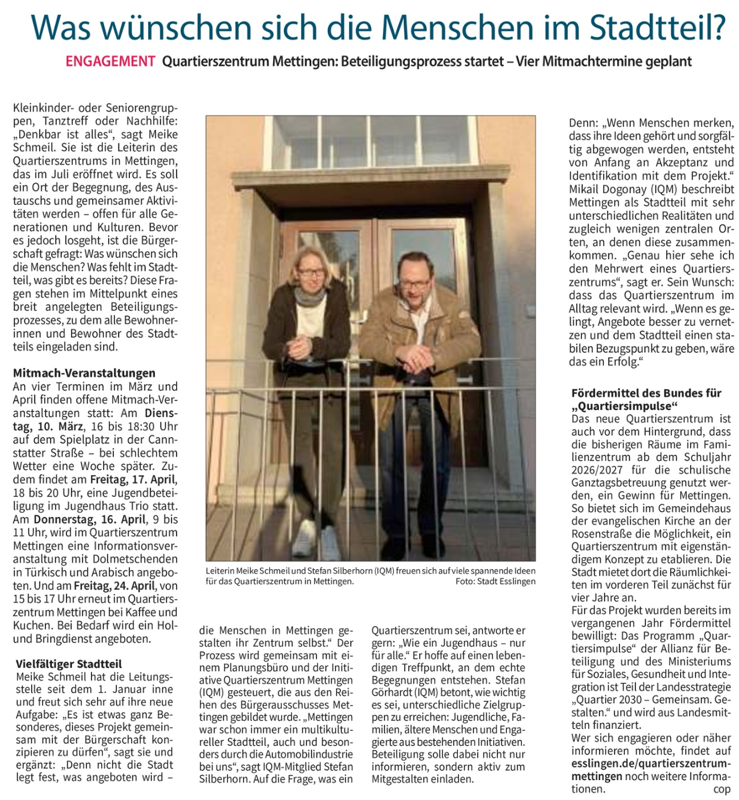 Damit Menschen im Stadtteil sich begegnen, austauschen und gemeinsam aktiv werden können, bauen wir das Quartierszentrum Mettingen auf und entwickeln gemeinsam mit den Bewohnerinnen und Bewohnern Ideen dafür, was dort alles möglich sein könnte – offen für alle Generationen und Kulturen. Auf dieser Seite finden Sie alle Neuigkeiten zum Projekt und zur Beteiligung.